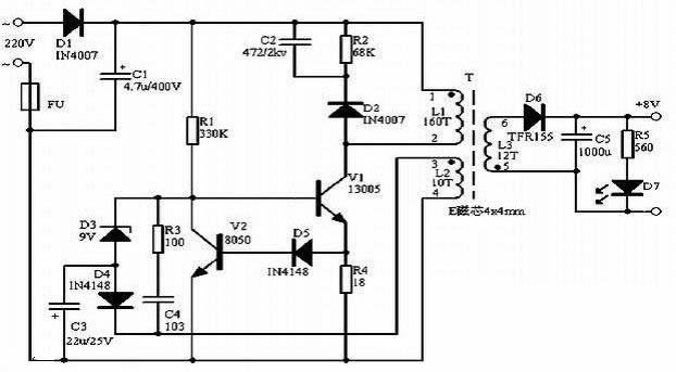 市電經(jīng)D1整流及C1濾波后得到約300V的直流電壓加在變壓器的①腳(L1的上端),同時此電壓經(jīng)R1給V1加上偏置后后使其微微導(dǎo)通,有電流流過L1,同時反饋線圈L2的上端(變壓器的③腳)形成正電壓,此電壓經(jīng)C4、R3反饋給V1,使其更導(dǎo)通,乃至飽和,最后隨反饋電流的減小,V1迅速退出飽和并截止,如此循環(huán)形成振蕩,在次級線圈L3上感應(yīng)出所需的輸出電壓。L2是反饋線圈,同時也與D4、D3、C3一起組成穩(wěn)壓電路。當(dāng)線圈L3經(jīng)D6整流后在C5上的電壓升高后,同時也表現(xiàn)為L2經(jīng)D4整流后在C3負(fù)極上的電壓更低,當(dāng)?shù)椭良s為穩(wěn)壓管D3(9V)的穩(wěn)壓值時D3導(dǎo)通,使V1有基極短路到地,關(guān)斷V1,最終使輸出電壓降低。電路中R4、D5、V2組成過流保護電路。當(dāng)某些原因引起V1的工作電流大太時,R4上產(chǎn)生的電壓互感器經(jīng)D5加至V2基極,V2導(dǎo)通,V1基極電壓下降,使V1電流減小。D3的穩(wěn)壓值理論為9V+0.5~0.7V,在實際應(yīng)用時,若要改變輸出電壓,只要更換不同穩(wěn)壓值的D3即可,穩(wěn)壓值越小,輸出電壓越低,反之則越高。